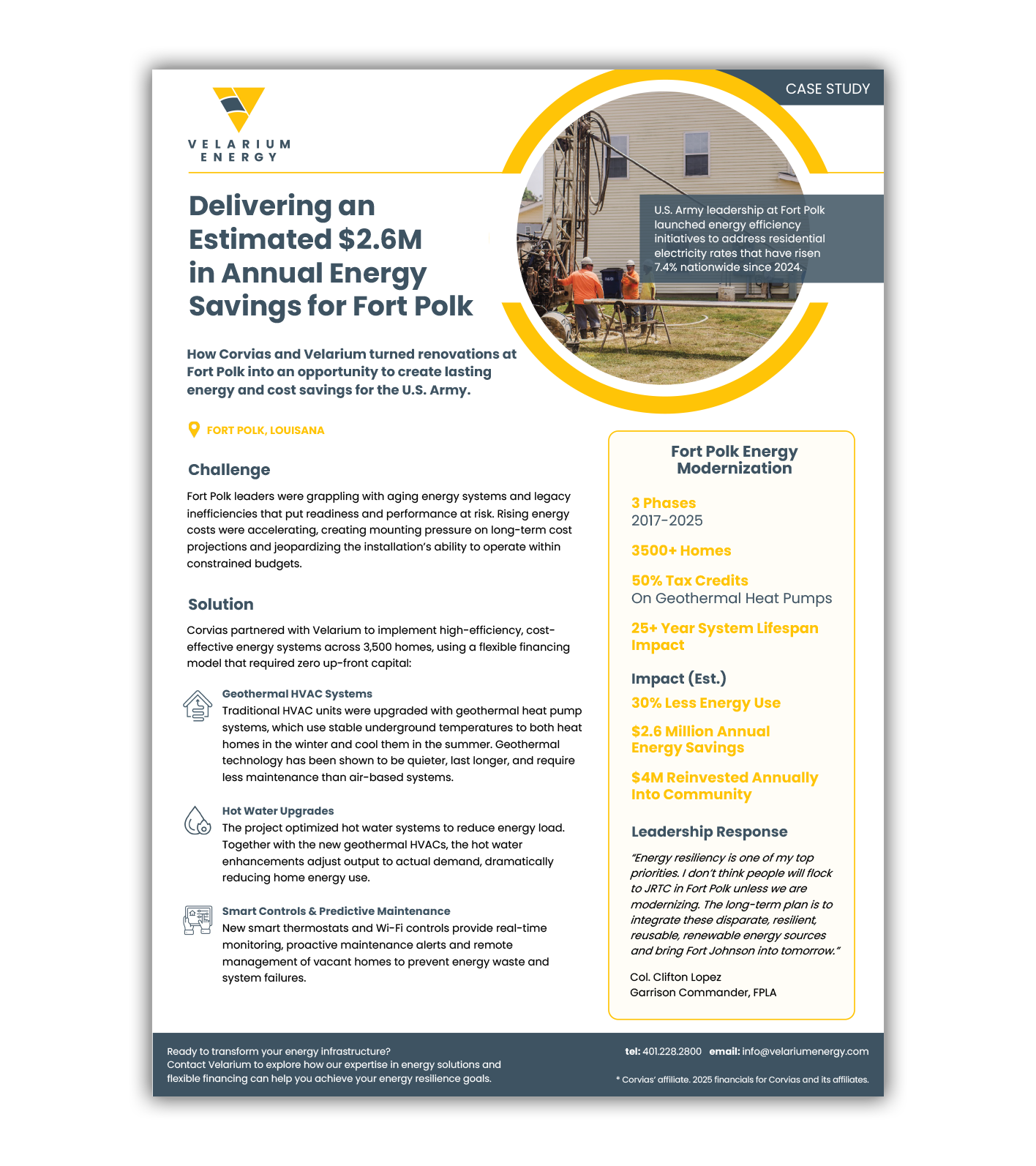 How Corvias and Velarium turned renovations at Fort Polk into an opportunity to create lasting energy and cost savings for the U.S. Army.